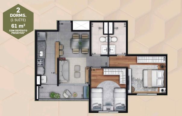 1 banheiro social, Sala aconchegante, Cozinha funcional, Varanda perfeita para relaxar, 1 vaga de garagem, Depósito privativo no subsolo (mais espaço para organização!), 3 elevadores no prédio, com Lazer completo para você e sua família: 2 piscinas amplas, Academia equipada, Churrasqueira, Espaço pet (pet care) , Sala de estética, Brinquedoteca