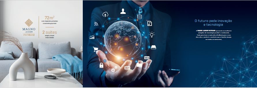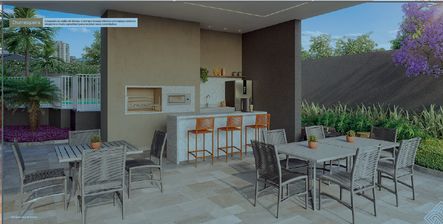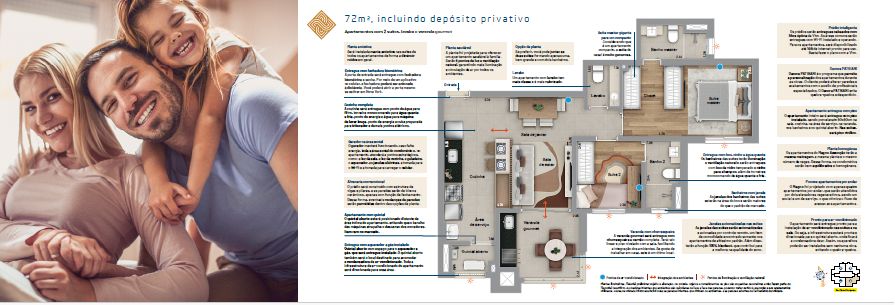 São apartamentos de 72m2, com duas suítes e lavabo, proporcionando privacidade aos moradores e às visitas. A varanda gourmet tem churrasqueira a carvão completa e é integrada à sala, dando mais amplitude ao ambiente. Lavabo e varanda gourmet são facilidades raras em um apartamento de 72m².